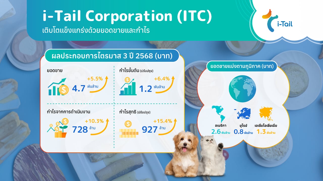 บริษัท ไอเทล คอร์ปอเรชั่น จำกัด (มหาชน) (ITC) ผู้นำระดับโลกในอุตสาหกรรมอาหารสัตว์เลี้ยง รายงานผลประกอบการไตรมาส 3 ปี 2568 ด้วยยอดขาย 4,721 ล้านบาท เติบโต 6.4% เมื่อเทียบกับช่วงเดียวกันของปีก่อน และเพิ่มขึ้น 5.5% จากไตรมาสก่อนหน้า โดยมียอดขายในสกุลดอลลาร์สหรัฐเพิ่มขึ้น 14.2% เมื่อเทียบกับปีก่อน อยู่ที่ 144 ล้านดอลลาร์สหรัฐ ซึ่งเป็นผลจากคำสั่งซื้อในตลาดสหรัฐอเมริกาและการขยายตลาดในยุโรป สะท้อนการเติบโตอย่างต่อเนื่องและความเชื่อมั่นจากลูกค้าแบรนด์อาหารสัตว์เลี้ยงชั้นนำ ทั้งนี้ บริษัทมีกำไรขั้นต้นปรับปรุงอยู่ที่ 1,192 ล้านบาท เพิ่มขึ้น 6.4% จากไตรมาสก่อน ขณะที่กำไรสุทธิปรับปรุงอยู่ที่ 927 ล้านบาท เพิ่มขึ้น 15.4% จากไตรมาสก่อนหน้า