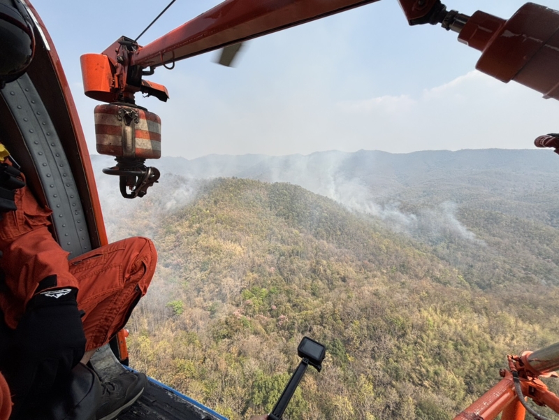 ในพื้นที่บ้านป่าสักงาม ต.ลวงเหนือ และ ต.เชิงดอย อ.ดอยสะเก็ด จ.เชียงใหม่ บินทิ้งน้ำ จำนวน 8 เที่ยวบิน ปริมาณน้ำ จำนวน 24,000 ลิตร