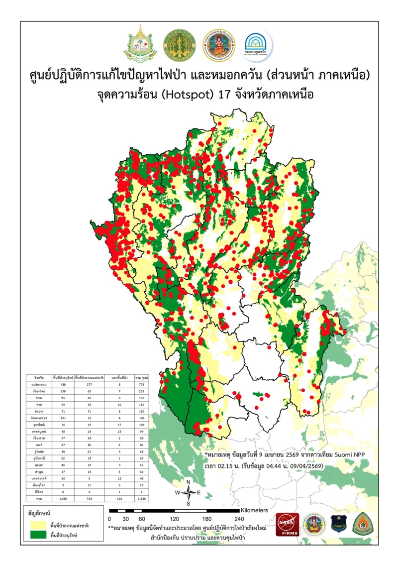 รายงานข้อมูลดาวเทียมเช้าวันที่ 9 เม.ย.2569 พบจุดความร้อนใน 17 จังหวัดภาคเหนือรวม 2,340 จุด ส่วนใหญ่อยู่ในพื้นที่ป่าอนุรักษ์ ขณะที่หลายพื้นที่ยังเผชิญค่าฝุ่น PM2.5 เกินมาตรฐานระดับสีแดง มากสุด อ.ปาย จ.แม่ฮ่องสอน 223.6 มคก./ลบ.ม.วันนี้ (9 เม.ย.2569) ศูนย์ปฏิบัติการแก้ไขปัญหาไฟป่า และหมอกควัน (ส่วนหน้า ภาคเหนือ) โดยกรมอุทยานแห่งชาติ สัตว์ป่า และพันธุ์พืช ขอส่งรายงานข้อมูล hotspot จากดาวเทียม Suomi NPP (ระบบ VIIRS) 17 จังหวัดภาคเหนือ วันที่ 9 เม.ย.2569 รอบเช้า เวลา 02.15 น. พบจุดความร้อนรวมทั้งสิ้น 2,340 จุด