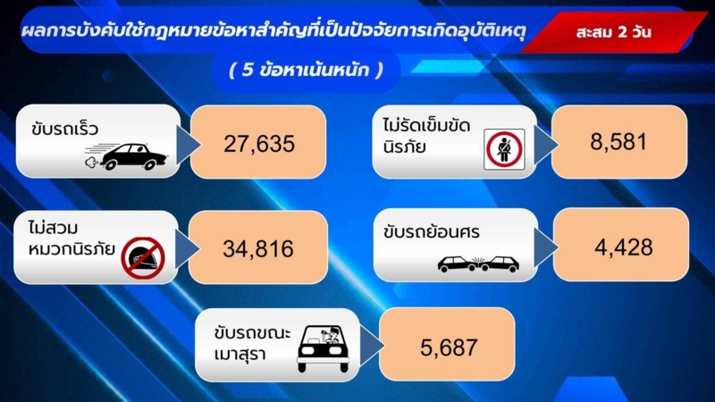 ไม่สวมหมวกนิรภัย 34,816 ครั้งขับรถเร็วเกิดกฎหมายกำหนด 27,635 ครั้งไม่คาดเข็มขัดนิรภัย 8,581 ครั้งขับรถขณะเมาสุรา 5,687 ครั้ง และในจำนวนนี้ มีผู้กระทำความผิดซ้ำ จำนวน 57 คนขับรถย้อนศร พบ 4,428 ครั้ง