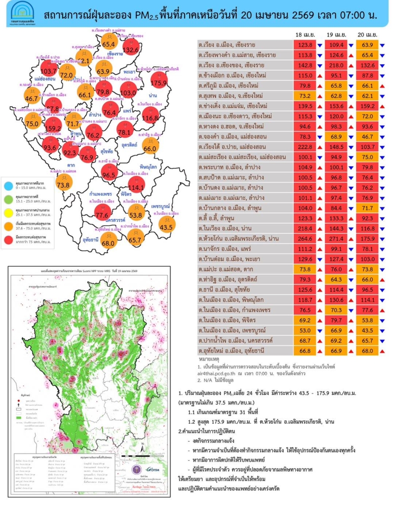 ค่าฝุ่น PM 2.5 ภาคเหนือ ยังสูงเกินค่ามาตรฐาน อยู่ในระดับสีแดง มีผลกระทบต่อสุขภาพ 17 พื้นที่ มากสุด ต.ห้วยโก่น อ.เฉลิมพระเกียรติ จ.น่าน วัดได้ 2175.9 มคก./ลบ.ม. ขณะที่ IQAir รายงาน เทศบาลนครเชียงใหม่ ติดอันดับ 4 เมืองมลพิษโลกวันนี้ (20 เม.ย.2569) เวลา 07.00 น. ศูนย์สื่อสารการแก้ไขปัญหามลพิษทางอากาศ รายงานการติดตามตรวจสอบคุณภาพอากาศ สรุปดังนี้