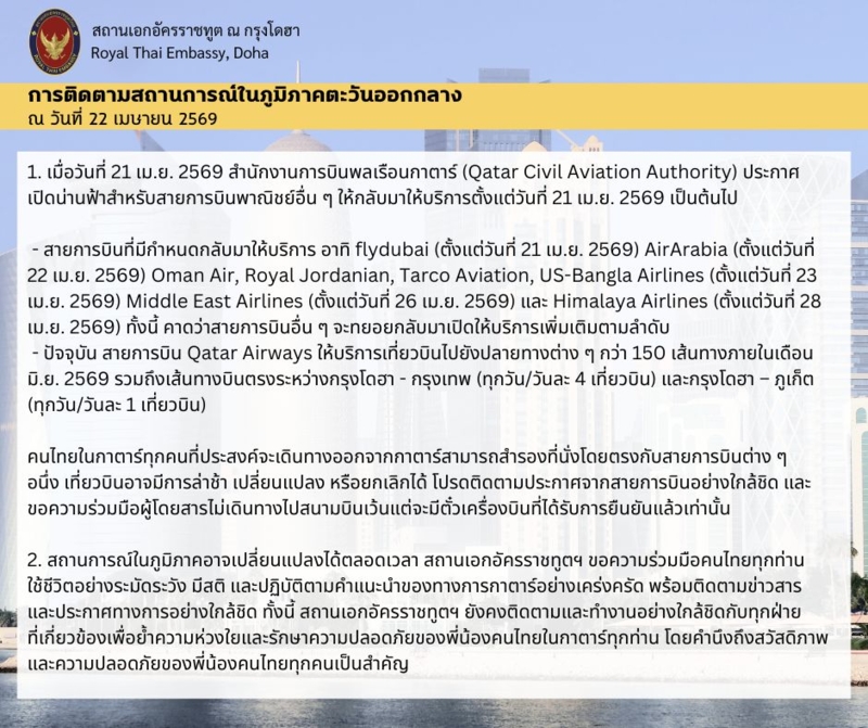 สถานเอกอัครราชทูต ณ กรุงโดฮา แจ้งอัปเดตสถานการณ์ หลังกาตาร์เปิดน่านฟ้าให้สายการบินพาณิชย์กลับมาให้บริการ แนะคนไทยติดตามเที่ยวบินอย่างใกล้ชิดวันนี้ (22 เม.ย.2569) สถานเอกอัครราชทูต ณ กรุงโดฮา อัปเดตสถานการณ์และคำแนะนำสำหรับคนไทยในกาตาร์ โดยระบุ เมื่อวันที่ 21 เม.ย.2569 สำนักงานการบินพลเรือนกาตาร์ ประกาศเปิดน่านฟ้าสำหรับสายการบินพาณิชย์อื่น ๆ ให้กลับมาให้บริการตั้งแต่วันที่ 21 เม.ย.2569 เป็นต้นไป