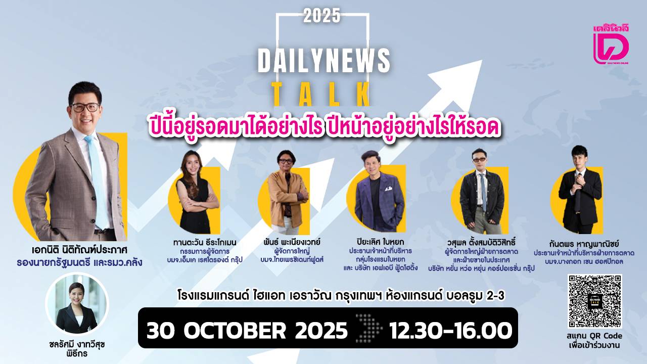 “เดลินิวส์ ทอล์ก 2025” ชวนถอดบทเรียนธุรกิจอยู่ให้รอดในปีแห่งความผันผวน พร้อมรับฟังปาฐกถาพิเศษจากผู้กำหนดนโยบายในหัวข้อเศรษฐกิจไทยปี 2569 อยู่ให้รอดได้อย่างไร?